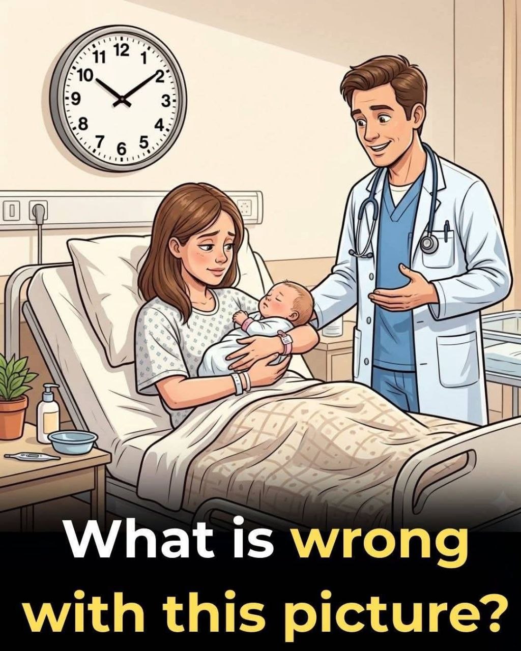 Brain teasers often bring to mind complex equations or logic grids—but not all puzzles require calculations. Some rely on something far more fundamental: your ability to truly see what’s in front of you.Take this seemingly ordinary image: a serene hospital maternity room. A new mother cradles her newborn, a doctor stands nearby, medical equipment is neatly arranged, and a clock hangs on the wall. At first glance, everything appears perfectly normal—just as you’d expect in a postpartum setting.But look again.Hidden in plain sight is a subtle anomaly—one so small that most people miss it entirely on their first pass.Did you spot it?The clue lies in the wall clock.